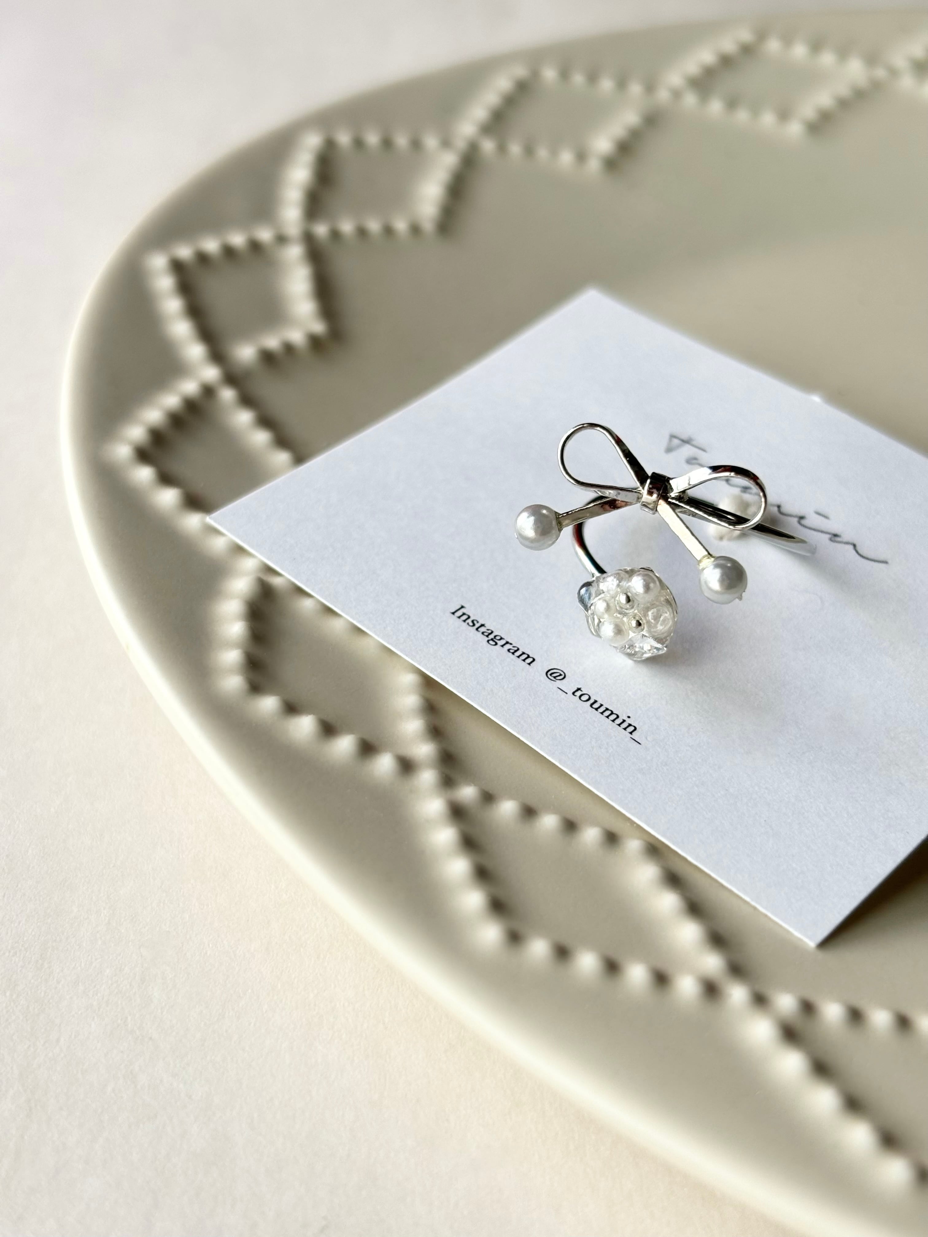 繊細なシルバーのリボンモチーフに、ホワイトパールをあしらったクリスマスにピッタリなリング。